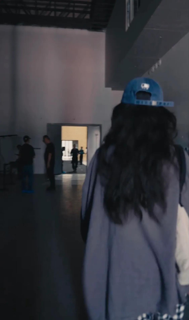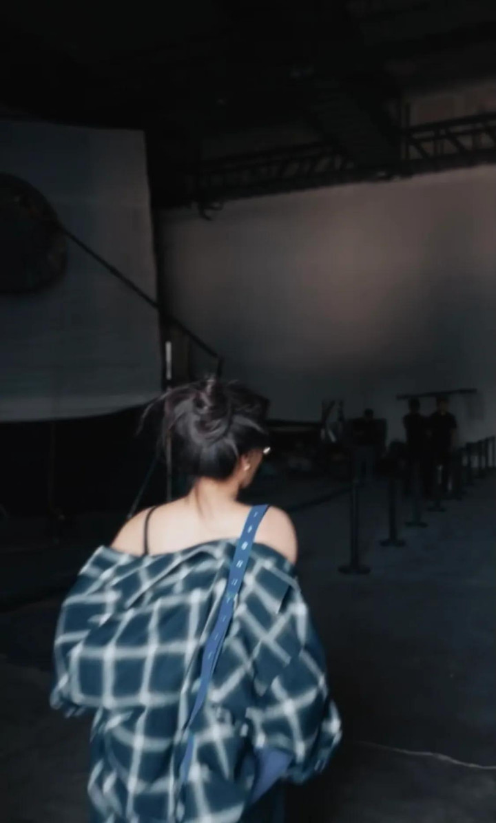 马思纯扎着高丸子头,她穿深蓝格纹衬衣,露着漂亮的肩膀,她这样穿很漂亮。马思纯瘦了,她说她白天基本不吃东西,她这么瘦没少挨饿啊。