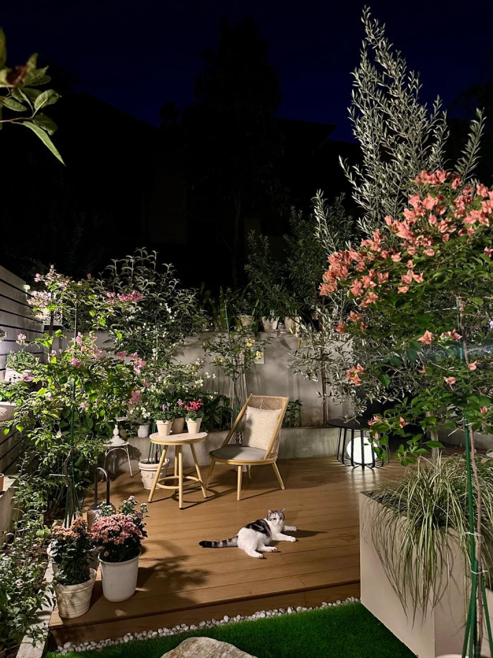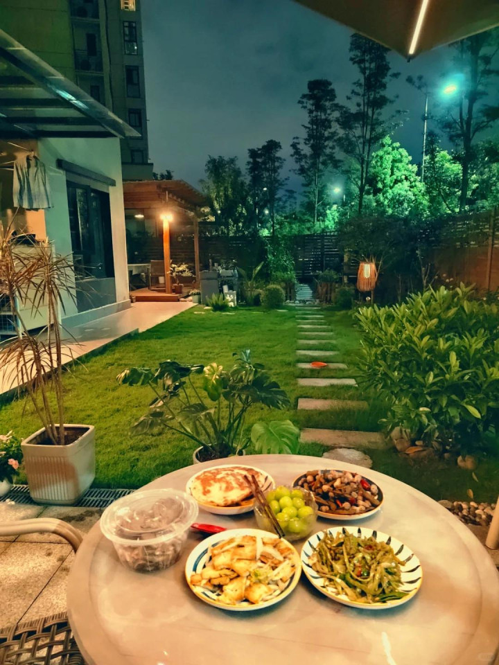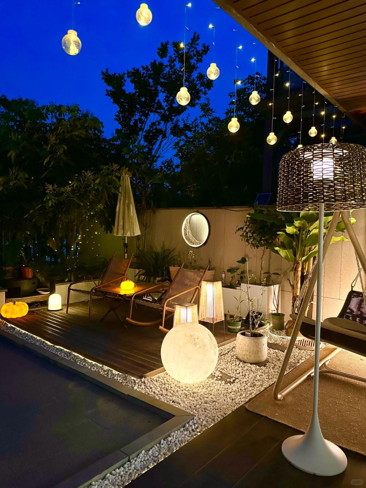夜幕降临,院子里挂起小灯串,暖黄色的光晕洒在四周。
