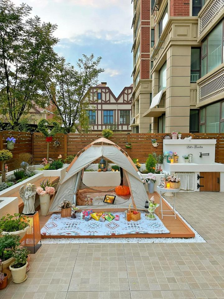 在院子里支起帐篷,铺上野餐垫,摆上水果和茶点。