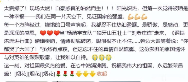 阅兵观礼名单能上,必须得“德艺双馨”或者“行业代表”,每一个动作、每一声口号都让她热泪盈眶。