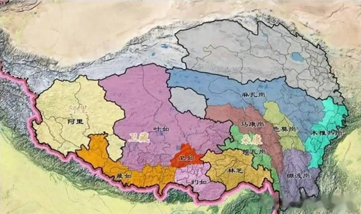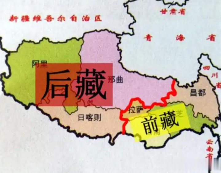 “前藏”包括今拉萨和山南市,“后藏”为今日喀则市,“阿里”指整个藏北高原(今阿里地区和那曲市西部)。