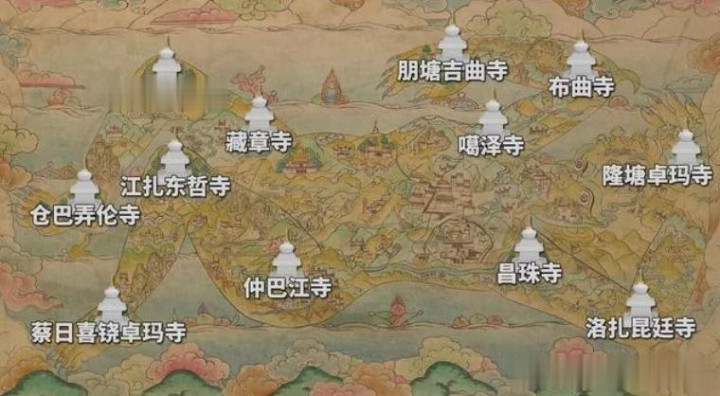 于是,松赞干布和文成公主多次商议,并缜密堪舆推算后,决定在女魔的头、肩、肘、髋、膝、手、足等全身部位,修建了吐蕃历史上著名的镇魔十二寺: