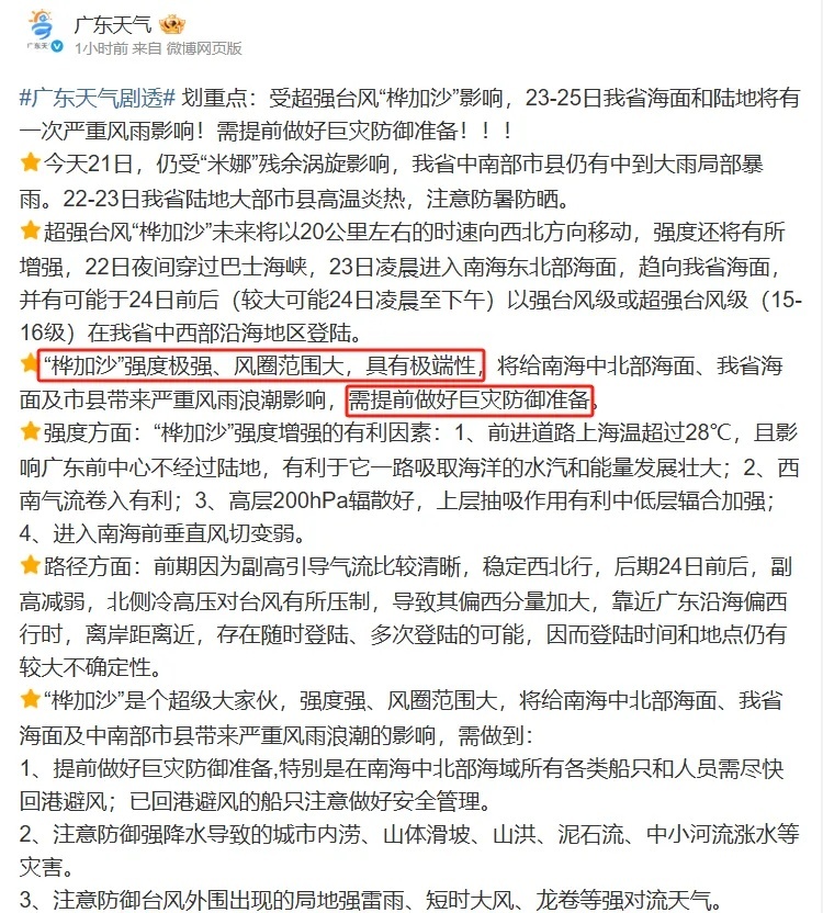 ❗路径方面:预计“桦加沙”将于22日夜间穿过巴士海峡进入南海海域,随后趋向我省海面,并有可能于24日前后(较大可能24日凌晨至下午)以强台风级或超强台风级在广东中西部沿海地区登陆。